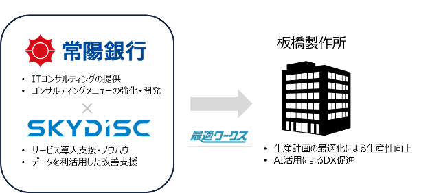 株式会社スカイディスク(代表取締役 内村 安里、所在地:福岡市中央区)は、株式会社常陽銀行(取締役頭取 秋野 哲也)と連携し、当社が提供するサービス「最適ワークス」の利活用を通じて製造業のお客さまの生産性向上を支援する実証取組みを9月25日(木)より開始しますので、下記のとおりお知らせいたします。