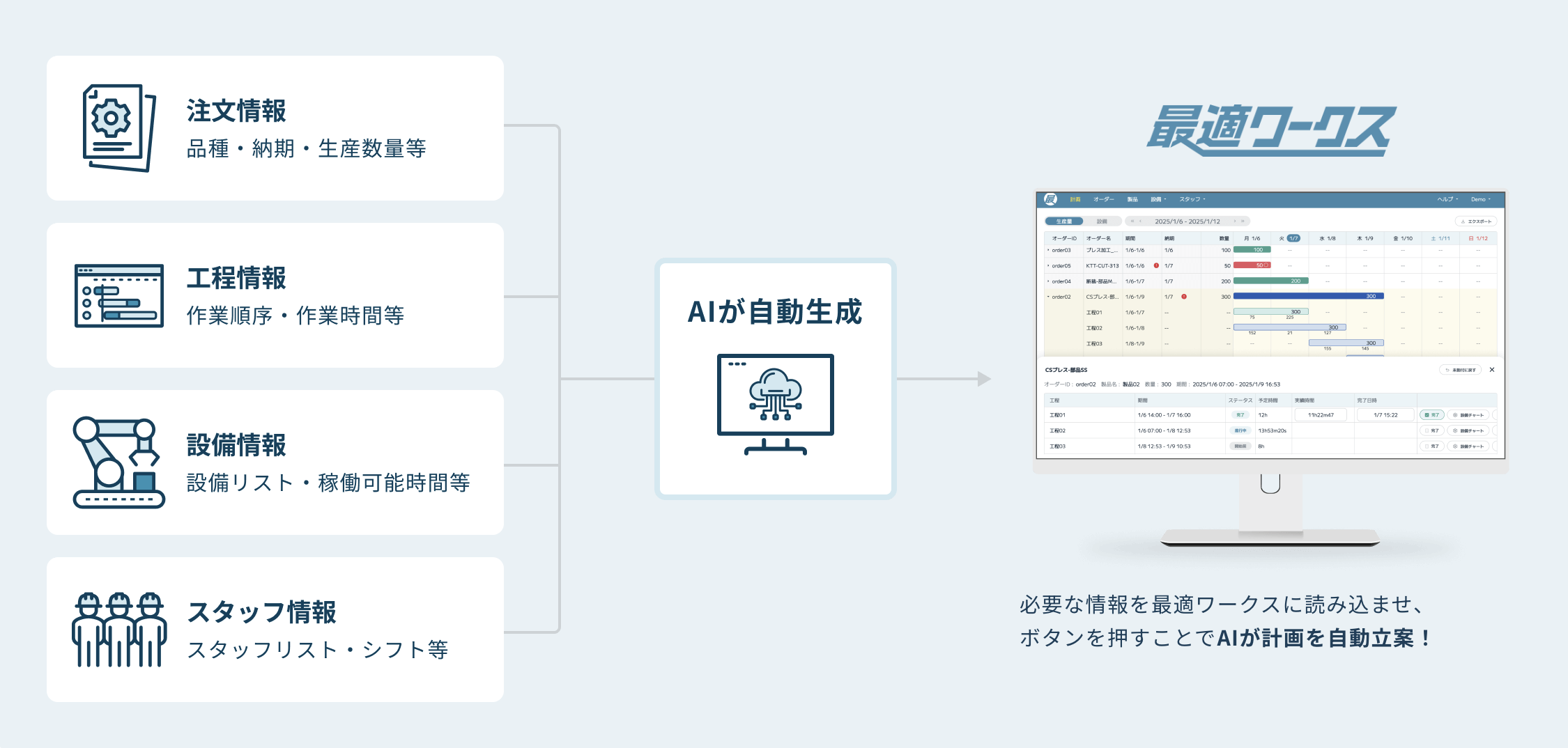 ・AIによる自動生産計画立案 最新アップデートを搭載した「最適ワークス」をデモ形式で体験できます。