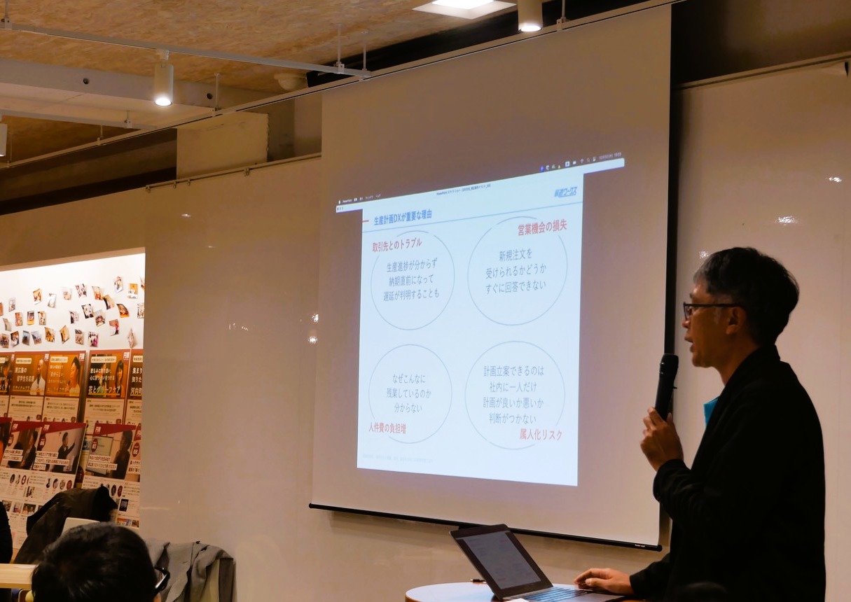 スカイディスクは、AIによる生産計画最適化クラウド「最適ワークス」を紹介し、生産計画担当者の負担軽減、属人化からの脱却、人手不足への対応策といったテーマについて、既存導入事例や運用のポイントを交えながら情報提供を行いました。